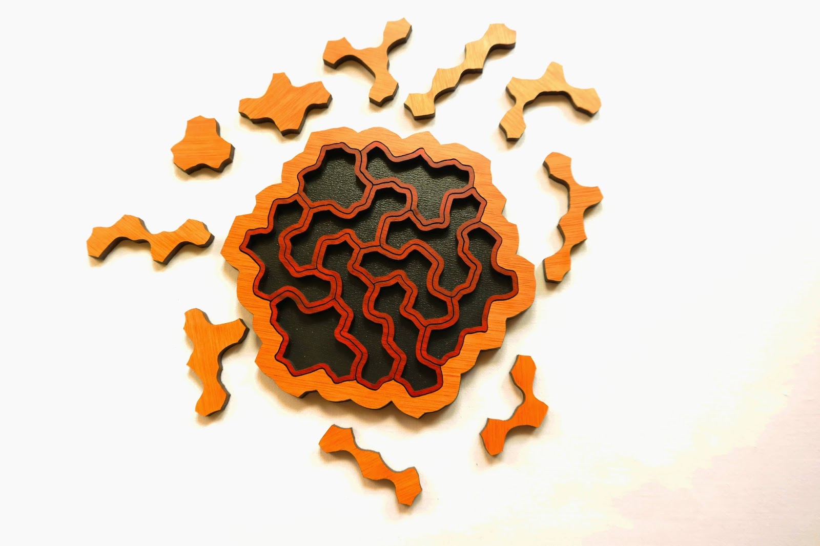 The Peanuts puzzle features 10 unique peanut-shaped pieces, although some of them are unusually irregular, even for a peanut...but that's what makes it so interesting. The pieces are laser-cut, so they fit perfectly inside the hexagonal frame. Another interesting aspect of this puzzle is that each individual peanut piece has its own shell that can be separate from its kernel. This doesn't exactly make the puzzle that much more difficult, since you can easily tell which shell belongs to what kernel and vice-versa, but it's nonetheless a neat feature of the puzzle. For example, you can solve the puzzle first with the shells only and then pack the other pieces at the end.